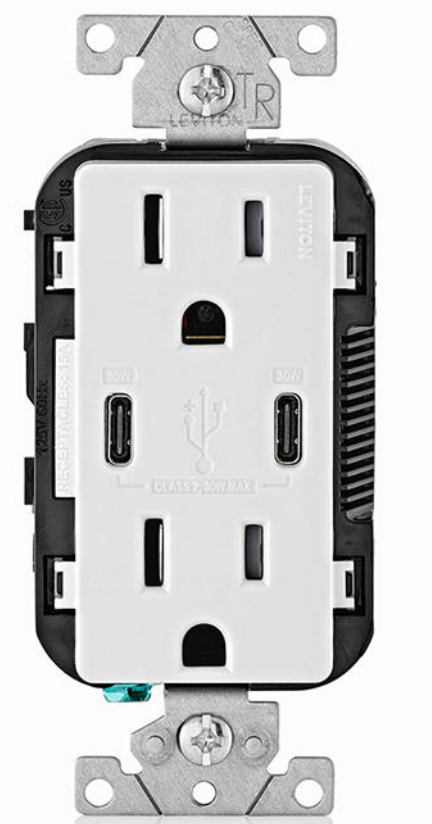 CARGADOR 2 USB TIPO C/C CON-POWER DELIVERY DE 30W 6A Y DÚPLEX TAMPER RESISTANT 15A - 125V~, BLANCO ID:T5635-00W